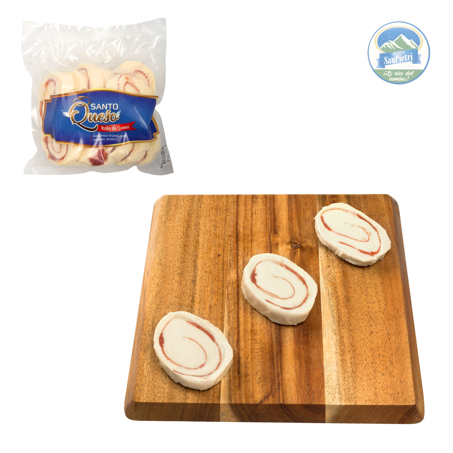Queso fresco de pasta hilada, semigraso, semiduro, moldeado artesanalmente en rollitos con relleno de jamón serrano.